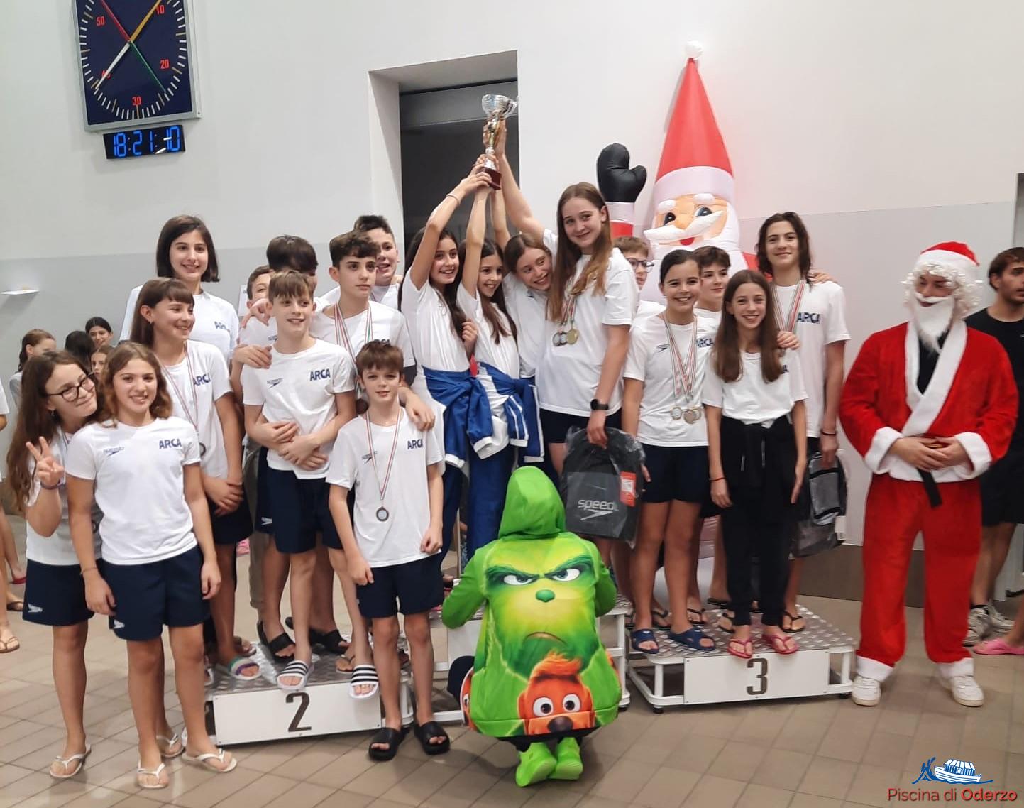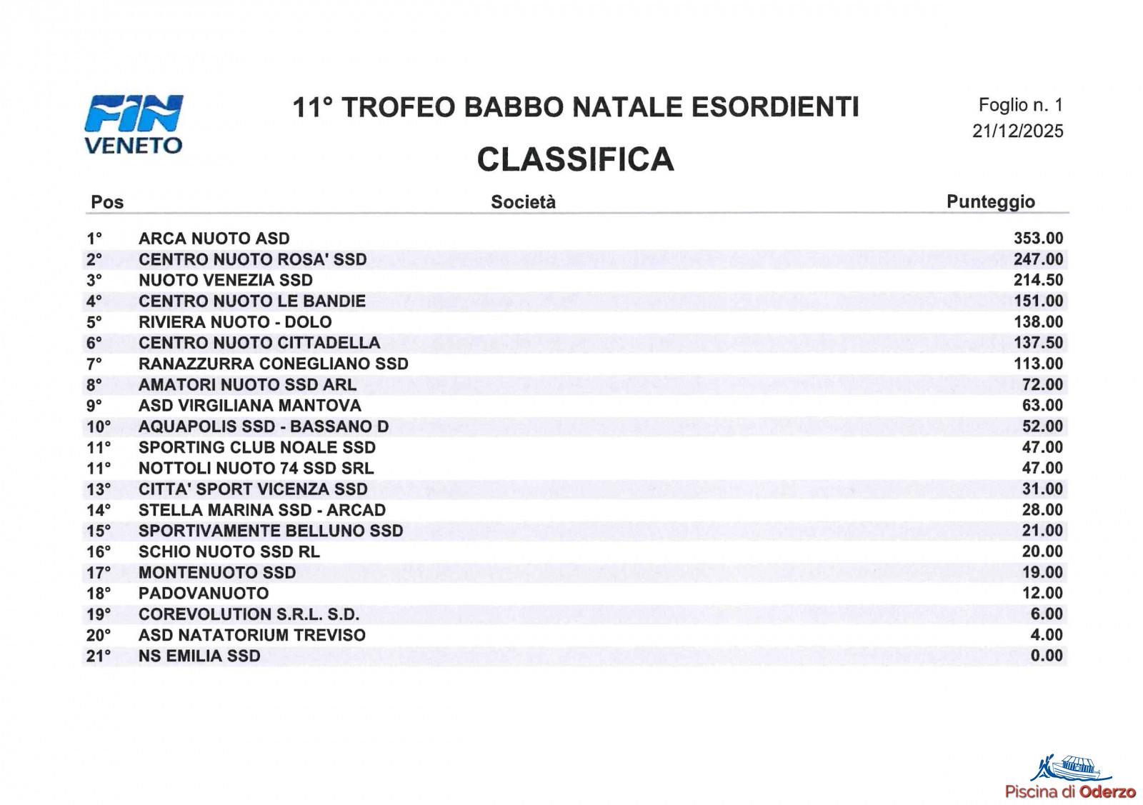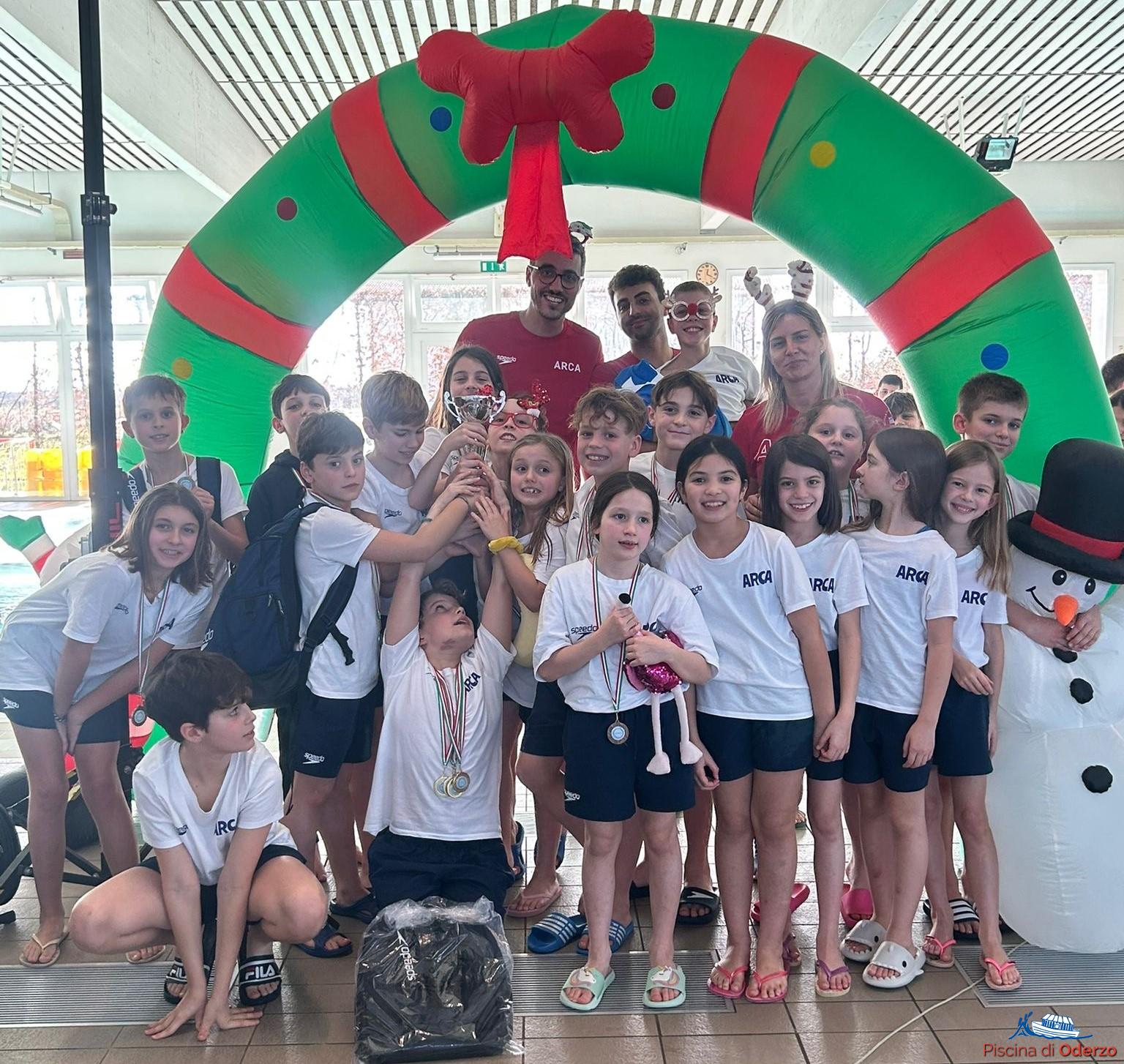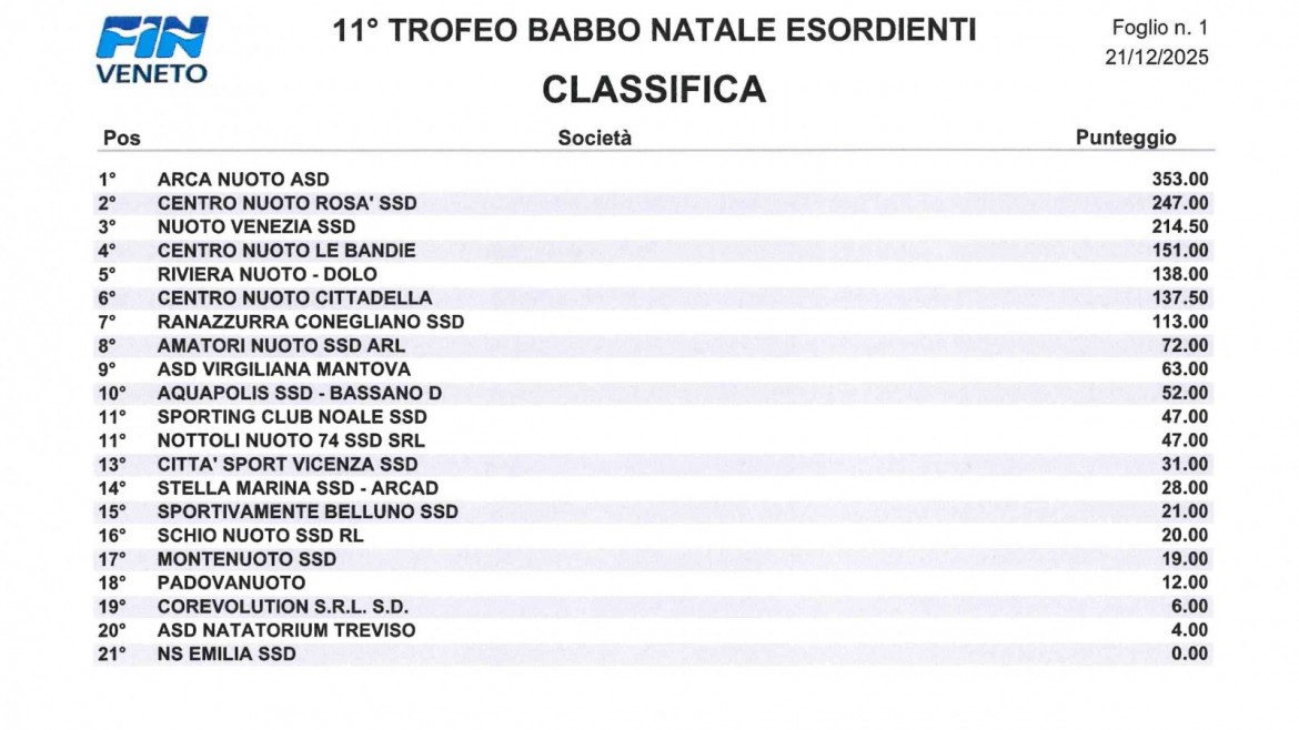 Articolo del 22/12/2025Classico appuntamento regionale riservato alle categorie Esordienti prima di fine anno, 11° Trofeo Babbo Natale è stato vinto anche quest'anno da Arca con 353 punti su 21 società partecipanti, svoltosi presso la piscina di Bassano del Grappa domenica 21 dicembre, Complimenti a tutti gli atleti e i tecnici!